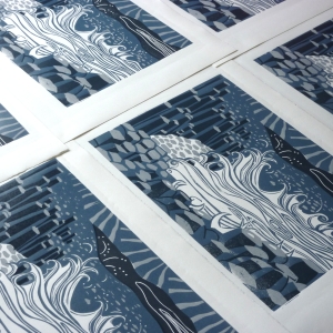 I've let a few other projects get in the way of my Giant's Causeway lino cut but finally I can see the light at the end of the tunnel*. I've cut three plates for each of the colours I will use, and of course there will be the white of the paper as a fourth. The design is more complex than anything i've attempt recently and i've a niggling doubt that the registration of the 3 plates might be a bit out. In the past I would have used the reduction method, but I found it too tricky to get a reasonable edition together, something would always go wrong with the last colour and having destroyed the plate in the process there was no going back. This is the mid colour plate and the most complicated of the three.